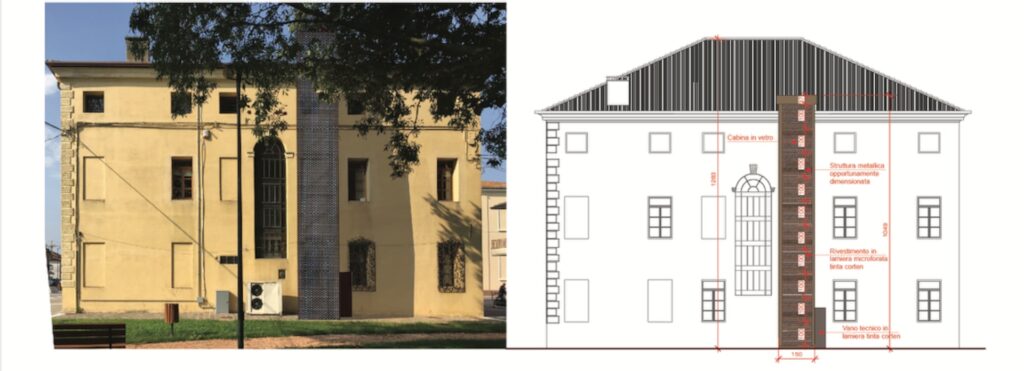 L’intervento consiste nella realizzazione di un elevatore che possa essere fruito dall’interno, ma che per forza di cose sia realizzabile all’esterno della sagoma dell’edificio. In conseguenza a questa proposta si è ipotizzata anche una parziale e limitata riorganizzazione degli spazi interni degli uffici comunali.