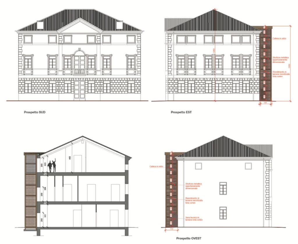 La scelta dei materiali è stata dettata sia da considerazioni di carattere funzionale che di carattere architettonico. E’ volontà della proposta dare dignità e identità sia all’edificio oggetto di intervento, una villa signorile del 1700 e sottoposta al vincolo monumentale, che al nuovo elemento, che pur rappresentando un impianto dovrà avere una sua caratterizzazione estetica tale da sposarsi in modo armonioso con il manufatto preesistente e il contesto circostante.